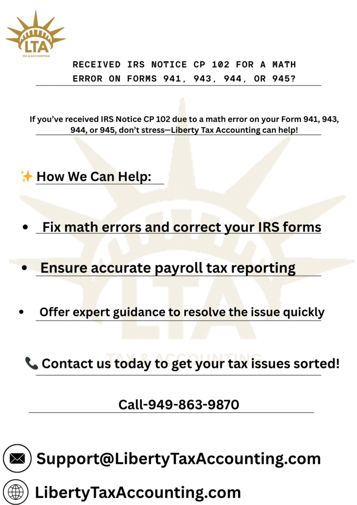 At Liberty Tax Accounting (California, USA), we specialize in helping businesses respond to IRS notices like CP102. Our team can review your employer tax returns, verify where discrepancies occurred, communicate with the IRS on your behalf, and set up manageable payment plans if needed. With our help, you can resolve the issue quickly, avoid escalating penalties and keep your business compliant. Contact Liberty Tax Accounting today to get expert guidance and peace of mind.