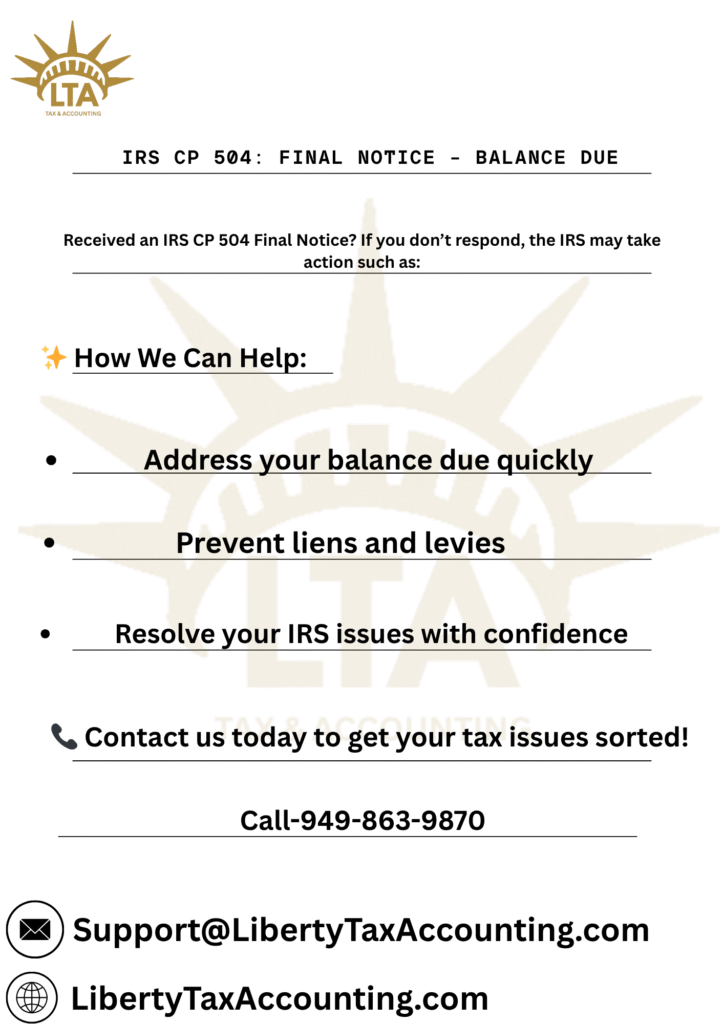 At Liberty Tax Accounting (California, USA), we specialize in helping individuals and businesses respond effectively to IRS levy notices like CP504. Our experienced IRS resolution team can review your case, handle direct communication with the IRS, and negotiate solutions that protect your income, assets, and financial stability. Contact Liberty Tax Accounting today for immediate support and professional guidance to stop an IRS levy before it starts.