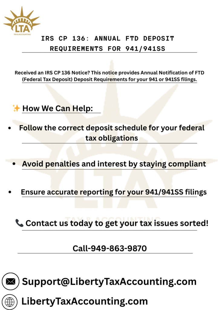 At Liberty Tax Accounting in California, our team of experienced payroll and tax professionals helps businesses understand IRS deposit requirements, set up accurate FUTA and payroll tax schedules, and remain fully compliant. Whether you need assistance interpreting your CP136 Notice, setting up EFTPS payments, or preventing future IRS issues, we’re here to help. Contact Liberty Tax Accounting today for expert IRS notice assistance, payroll setup, and complete business tax compliance — ensuring peace of mind and penalty-free operations.