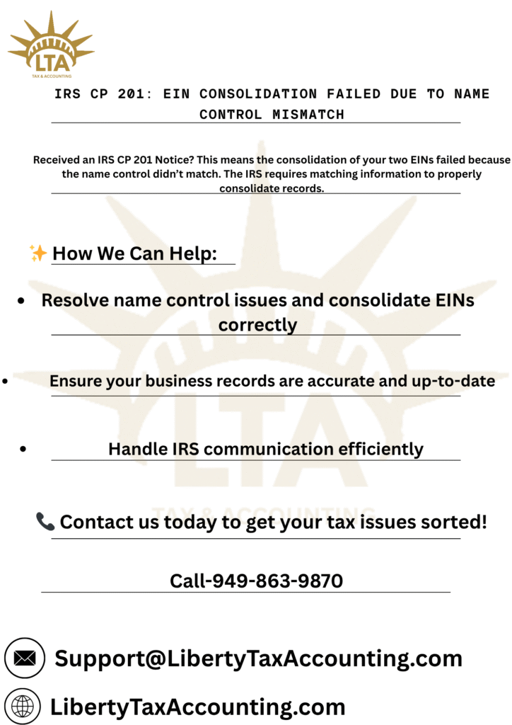 At Liberty Tax Accounting (California, USA), we specialize in IRS notice resolution, tax correction, and client representation. Our experienced professionals can help you understand what the CP201 means, review your return for discrepancies, and communicate with the IRS on your behalf. Whether it’s a minor correction or a complex adjustment, we make sure your tax record stays accurate and compliant. Contact Liberty Tax Accounting today for expert IRS assistance and peace of mind.